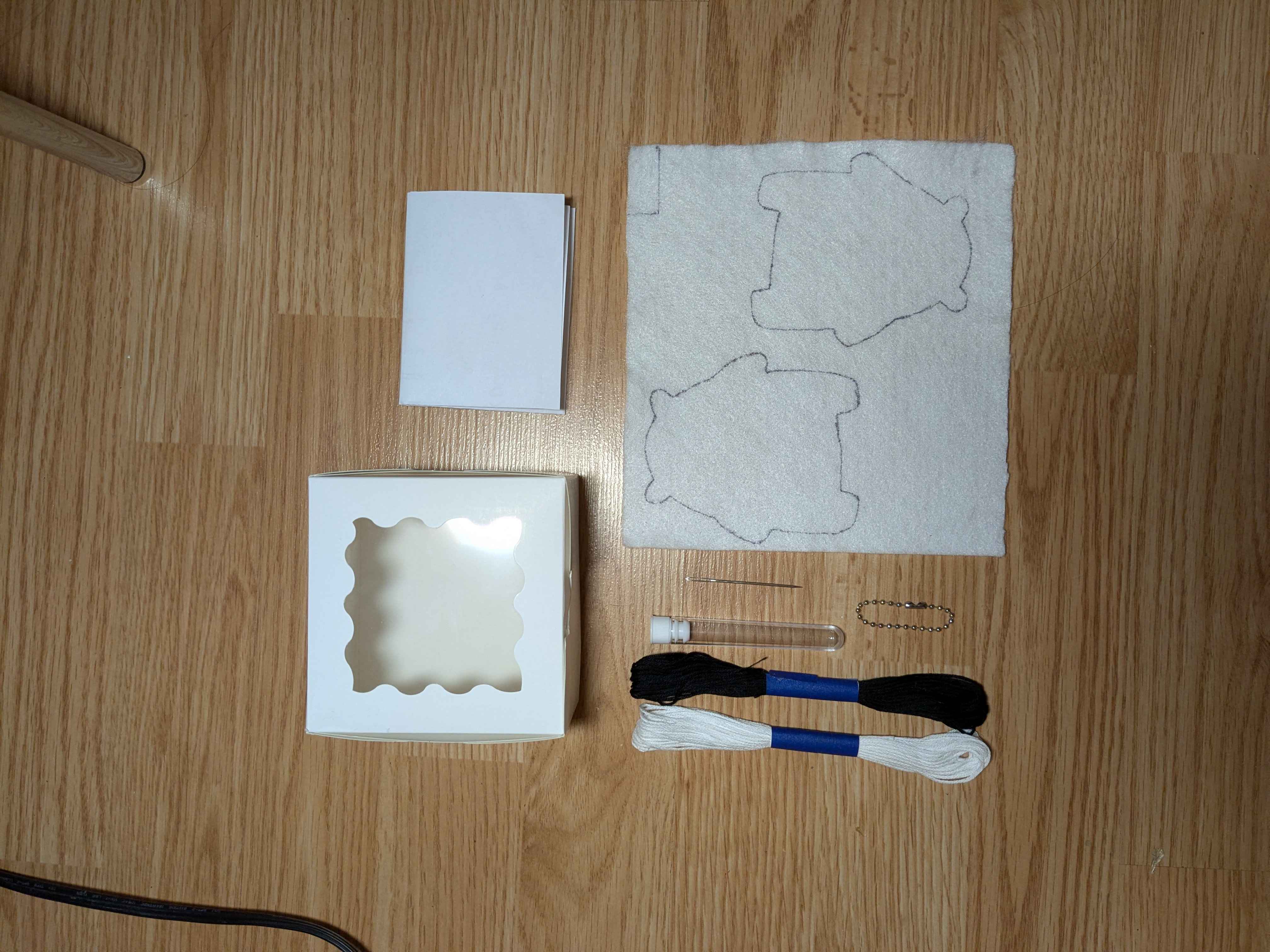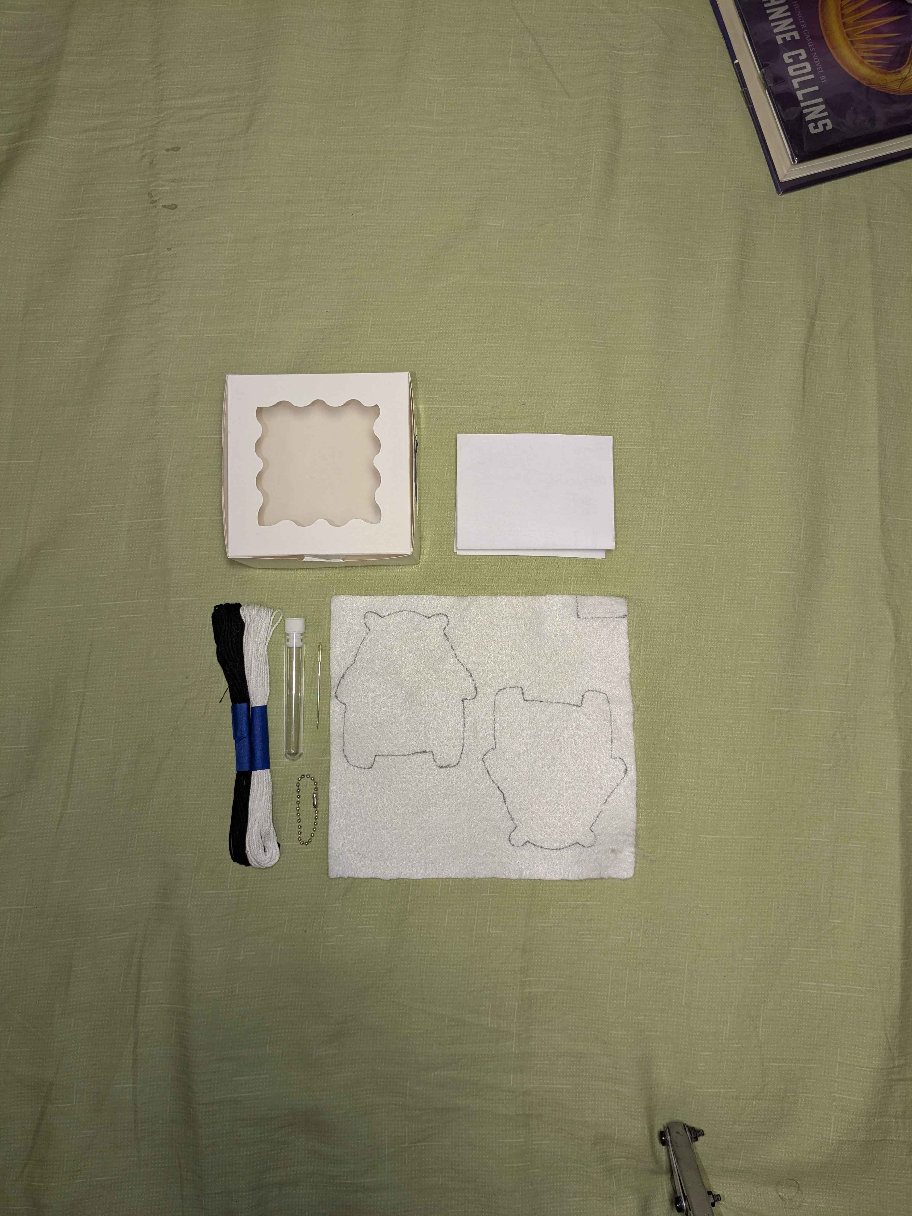 The kit comes with Felt outlined so the stitcher can cut it out. AN instruction Manual to learn how to stitch you very own stitchling. Sewing string and a needle are also provided.